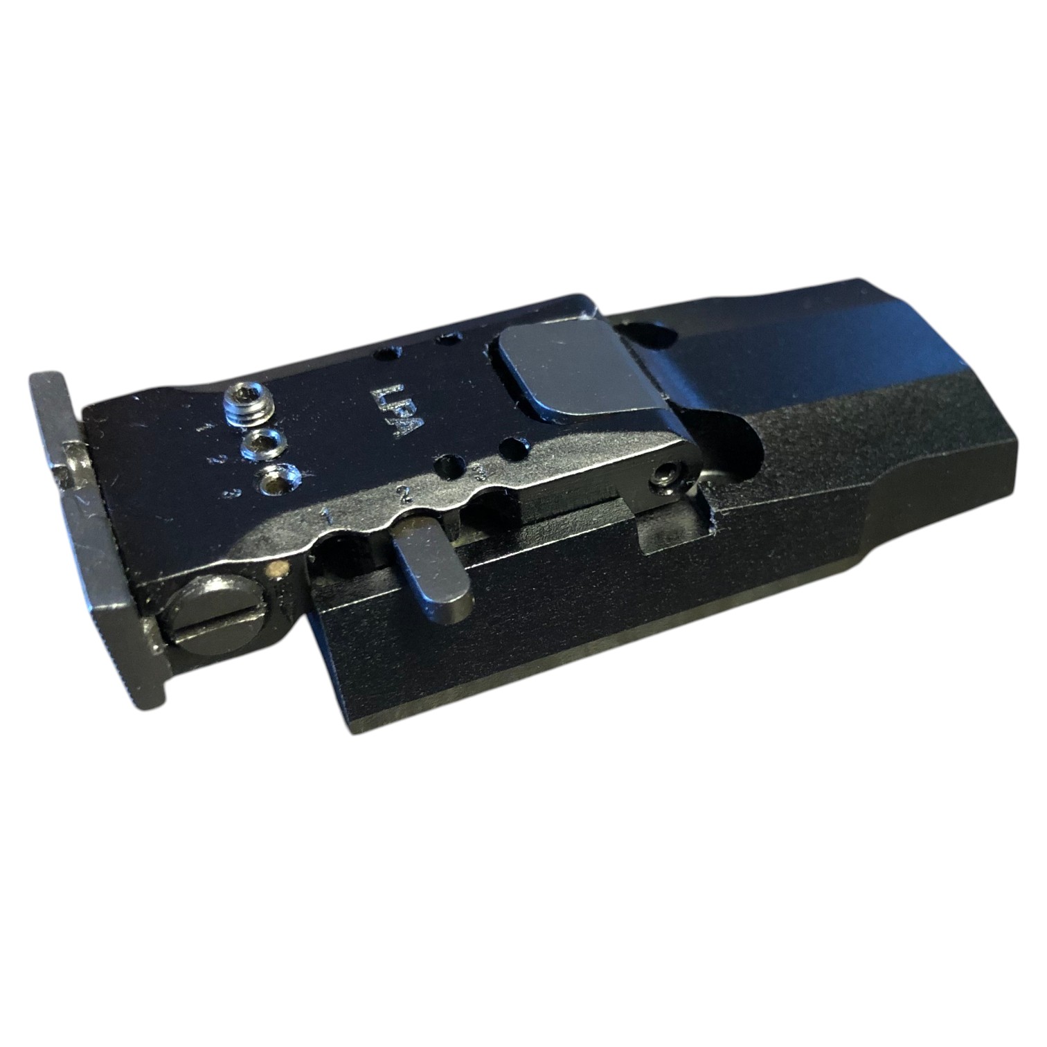 Eingestellt wird es indem mit dem seitlichen Hebel eine Position ausgewählt wird (z.B Pos. 2 Fleck). Nun wird bei Tiefschuss die 2er Madenschraube im Uhrzeigersinn korrigiert.